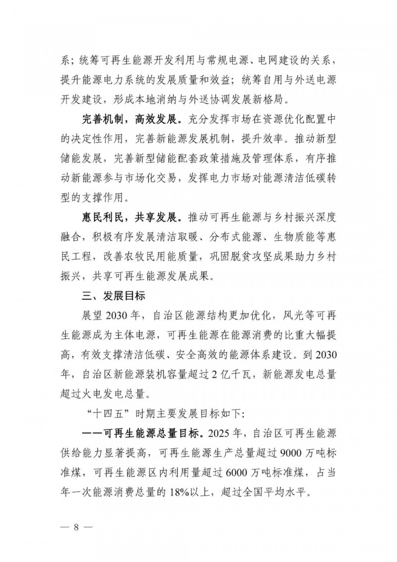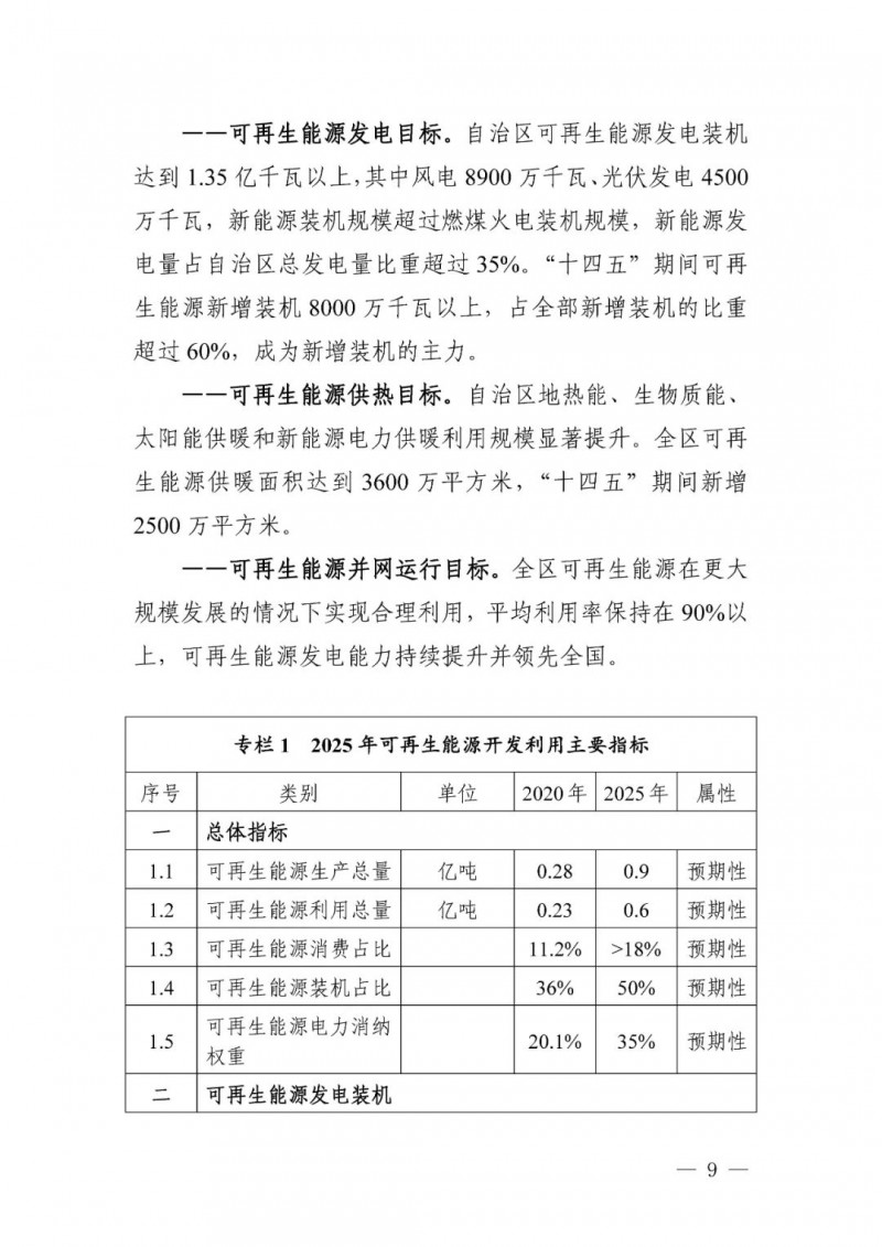 可再生能源總量目標(biāo)。至2025 年,自治區(qū)可再生能源生產(chǎn)總量超過 9000萬噸標(biāo)準(zhǔn)煤,可再生能源區(qū)內(nèi)利用量超過6000萬噸標(biāo)準(zhǔn)煤,占當(dāng)年一次能源消費(fèi)總量的18%以上,超過全國平均水平。