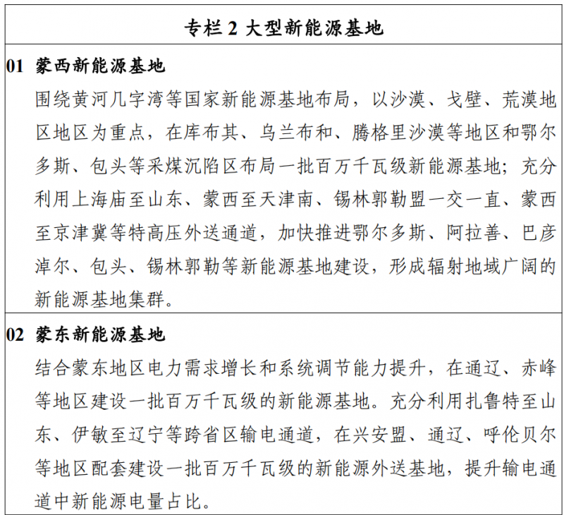 因地制宜推進(jìn)太陽能熱發(fā)電發(fā)展??偨Y(jié)首批太陽能熱發(fā)電示范項目建設(shè)經(jīng)驗,發(fā)揮太陽能熱發(fā)電儲能調(diào)節(jié)能力和系統(tǒng)支撐能力,因地制宜建設(shè)太陽能熱發(fā)電項目。充分發(fā)揮太陽能熱發(fā)電在電力系統(tǒng)中調(diào)峰、調(diào)頻、儲能等多元功能,統(tǒng) 籌推動太陽能熱發(fā)電與風(fēng)電光伏基地一體化建設(shè)運行,為新能源高比例自用和外送提供支撐,力爭“十四五”期間新增并網(wǎng)太陽能熱發(fā)電項目 50 萬千瓦。加快推進(jìn)新型儲能技術(shù)規(guī)?;瘧?yīng)用。探索采用自建、合建、租賃和共享等多元化模式,加快推動新型儲能在發(fā)電側(cè)、 電網(wǎng)側(cè)、用戶側(cè)的規(guī)模化應(yīng)用,實現(xiàn)新能源與新型儲能的協(xié)同發(fā)展,原則上新建新能源項目要配置 15%(2 小時)以上的儲能設(shè)施。研究出臺存量新能源項目增配儲能的管理辦法,推動已并網(wǎng)的新能源項目增配儲能設(shè)施,提高消納和調(diào)峰能力。在充分發(fā)揮電力外送通道配套火電機(jī)組深度調(diào)峰能力的基礎(chǔ)上,合理規(guī)劃建設(shè)送端配套新型儲能設(shè)施,支撐大規(guī)模風(fēng)、光等可再生能源電源接入,提升外送通道可再生能源電量占比。二、充分提升可再生能源就地消納水平加快配套電網(wǎng)建設(shè)。優(yōu)化升級電網(wǎng)主網(wǎng)架,解決電網(wǎng)結(jié)構(gòu)性問題,提升電力互濟(jì)能力,提高電網(wǎng)運行效率和安全穩(wěn)定水平。加快推動新能源送出工程建設(shè),滿足新能源大規(guī)模開發(fā)的匯集與送出需求。推動配電網(wǎng)擴(kuò)容改造和智能化升 級,提升配電網(wǎng)柔性開放接入能力、靈活控制能力和抗擾動能力,增加電網(wǎng)就地就近平衡能力,構(gòu)建適應(yīng)分布式可再生能源并網(wǎng)和多元負(fù)荷需要的智能配電網(wǎng)。提升系統(tǒng)調(diào)節(jié)能力。積極推進(jìn)煤電靈活性改造,推動自備電廠主動參與調(diào)峰,加快建設(shè)天然氣調(diào)峰電站,充分提升系統(tǒng)調(diào)節(jié)能力。優(yōu)化電力調(diào)度運行,合理安排系統(tǒng)開機(jī)方式, 動態(tài)調(diào)整各類電源發(fā)電計劃,探索推進(jìn)多種電源聯(lián)合調(diào)度。創(chuàng)新調(diào)度運行與市場機(jī)制,促進(jìn)可再生能源在省級電網(wǎng)內(nèi)就地消納。三、穩(wěn)步有序推動可再生能源外送消納充分發(fā)揮自治區(qū)可再生能源資源優(yōu)勢和區(qū)位優(yōu)勢,按照提升一批、投產(chǎn)一批、開工一批的發(fā)展思路,努力提高輸電 通道中新能源電量的占比,提高特高壓輸電通道利用率,大力提升可再生能源外送消納能力,有序推動國家級新能源電力供應(yīng)保障基地建設(shè),助力全國碳達(dá)峰碳中和。“十四五” 期間,規(guī)劃新增新能源外送基地 2900 萬千瓦,力爭累計投產(chǎn) 3900 萬千瓦。加快推動已批復(fù)新能源外送基地投產(chǎn)運行。加快推動錫林郭勒盟“一交一直”一期、上海廟至山東一期、扎魯特至青州特高壓輸電通道配套新能源基地、烏蘭察布風(fēng)電基地等已批復(fù)新能源基地建設(shè)進(jìn)度,力爭 2025 年前建成投產(chǎn) 1500 萬千瓦左右。提升既有外送通道中新能源電量占比。提高自治區(qū)可再生能源外送規(guī)模,在蒙西至天津南交流特高壓、上海廟至山 東直流特高壓、錫林郭勒盟交直流特高壓等既有特高壓外送 輸電通道以及傳統(tǒng)火電廠外送專線基礎(chǔ)上,統(tǒng)籌送端周邊地區(qū)資源條件和環(huán)境約束,合理優(yōu)化風(fēng)能、太陽能資源配置方 案,增配布局一批新能源基地,大幅提高存量外送輸電通道中可再生能源占比和通道利用效率,“十四五”期間建成外送新能源 1900 萬千瓦。積極推進(jìn)新建蒙西外送通道配套新能源基地開工建設(shè)。統(tǒng)籌優(yōu)化蒙西地區(qū)風(fēng)能、太陽能資源和接入條件,在資源稟賦較好、開發(fā)建設(shè)條件優(yōu)越、具備持續(xù)整裝開發(fā)條件的地區(qū), 推進(jìn)風(fēng)能、太陽能、煤炭等多能互補(bǔ)發(fā)展,有序建設(shè)一批百萬千瓦級新能源基地,實現(xiàn)高比例可再生能源外送,力爭2025 年前推動開工配套新能源基地 1000 萬千瓦。