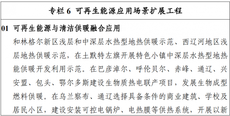 四、廣泛擴(kuò)展可再生能源應(yīng)用場景實施火電靈活性改造。加快存量煤電改造升級,推廣深度調(diào)峰技術(shù)應(yīng)用,積極推進(jìn)現(xiàn)役煤電機(jī)組實施靈活性改造, 鼓勵新建煤電機(jī)組靈活性制造,降低新建煤電機(jī)組最小技術(shù)出力水平,提升電力系統(tǒng)整體消納能力,促進(jìn)新能源大規(guī)模開發(fā)和高效利用,引導(dǎo)煤電由主力電源逐步向“支撐型”、“調(diào) 節(jié)型”電源轉(zhuǎn)變。推進(jìn)工業(yè)園區(qū)可再生替代。充分挖掘燃煤自備電廠園區(qū)的電源靈活調(diào)節(jié)能力和負(fù)荷側(cè)需求響應(yīng)能力,推動園區(qū)自備電廠參與調(diào)峰,改變單一依靠自備火電的傳統(tǒng)供能方式,因地制宜推動風(fēng)電、光伏建設(shè),鼓勵集中式與分布式并舉,在 不占用公共電網(wǎng)的消納空間且保證用能安全的前提下實現(xiàn) 新能源全額自發(fā)自用,逐步實現(xiàn)園區(qū)用能清潔化。開展低碳工業(yè)園區(qū)示范。鼓勵具備新增負(fù)荷的園區(qū)開展低碳工業(yè)園示范項目,以近零碳用能為目標(biāo),率先開展全清潔能源供電,提升園區(qū)整體能效。通過自建分布式、新能源專線供電、綠色電力交易、綠證交易等多種方式,實現(xiàn)園區(qū)新增用電需求主要由新能源滿足。同時,鼓勵園區(qū)通過配置儲能等措施,保證與園區(qū)負(fù)荷的匹配響應(yīng)和高比例自平衡, 不占用公共電網(wǎng)消納空間。推廣“綠電+綠氫”發(fā)展新模式。鼓勵采用具有適應(yīng)可再生能源出力波動的綠色制氫技術(shù),加快推進(jìn)風(fēng)光氫儲一體化示范,推廣氫燃料電池汽車在礦山、物流、公交等領(lǐng)域的規(guī)?;瘧?yīng)用,積極探索氫能在冶金、化工、交通等領(lǐng)域的應(yīng)用。開展源網(wǎng)荷儲一體化示范。充分挖掘和釋放生產(chǎn)側(cè)、消費側(cè)調(diào)節(jié)能力,最大化發(fā)揮負(fù)荷側(cè)調(diào)節(jié)響應(yīng)能力,就近合理配套新能源,加強(qiáng)源網(wǎng)荷儲多向互動,通過電價優(yōu)勢帶動儲能、大數(shù)據(jù)、新能源、新材料等行業(yè)全產(chǎn)業(yè)鏈發(fā)展。加快烏蘭察布、通遼源網(wǎng)荷儲一體化示范工程建設(shè),提升本地電源支撐,有效緩解供電缺口,推動局部新能源就近消納,不占用公共電網(wǎng)調(diào)峰和消納空間,提升新能源開發(fā)利用水平。持續(xù)推廣可再生能源清潔供暖。發(fā)揮自治區(qū)風(fēng)能、光伏、農(nóng)林、地?zé)豳Y源優(yōu)勢,建立多元化可再生能源清潔供暖體系, 促進(jìn)環(huán)境質(zhì)量和人民生活條件改善。在呼包鄂城市群積極推動中深層地?zé)崮芤?guī)?;┡痉?,創(chuàng)新城市用能新模式。在蒙東地區(qū)發(fā)展生物質(zhì)熱電聯(lián)產(chǎn)項目,探索以農(nóng)林生物質(zhì)、生物質(zhì)成型燃料等為燃料的生物質(zhì)鍋爐供熱方式,有效保護(hù)城鄉(xiāng)環(huán)境。在呼和浩特、包頭、烏蘭察布、通遼等地,開展清潔電供暖示范。大力發(fā)展以新能源為主的綜合能源應(yīng)用。結(jié)合配電網(wǎng)、燃?xì)饩W(wǎng)、熱力網(wǎng)等能源網(wǎng)絡(luò),綜合可再生能源、儲能、信息通訊等先進(jìn)技術(shù),推動分布式可再生能源高效靈活接入與生產(chǎn)消費一體化,建設(shè)冷熱水電氣供應(yīng)的區(qū)域綜合能源系統(tǒng)。