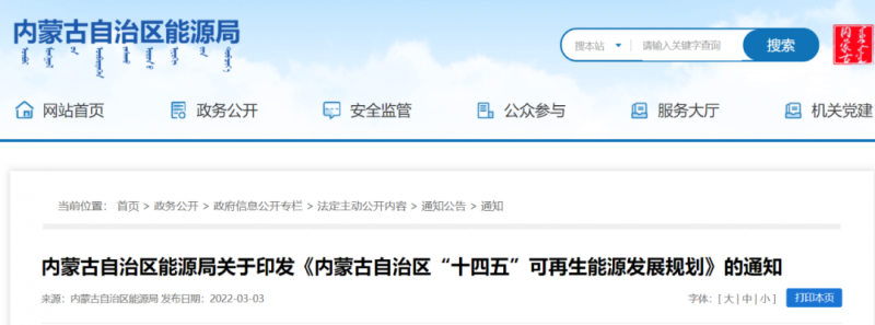 2022年3月2日,內(nèi)蒙古自治區(qū)能源局關(guān)于印發(fā)《內(nèi)蒙古自治區(qū)“十四五”可再生能源發(fā)展規(guī)劃》,提出:"十四五"末,內(nèi)蒙古可再生能源發(fā)電裝機(jī)達(dá)到 1.35 億千瓦以上,其中風(fēng)電 8900 萬千瓦、光伏發(fā)電 4500 萬千瓦,相當(dāng)于新增風(fēng)電項目5115萬千瓦,光伏項目3262萬千瓦,共8377萬千瓦,包含本地消納和外送兩類。平均利用率保持在 90%以上。同時,將依據(jù)國土空間規(guī)劃,完善可再生能源空間用途管制規(guī)則,保障可再生能源開發(fā)利用合理的用地空間需求。落實草原林地征占用分區(qū)管控政策,保障可再生能源項目使用草原林地需求。規(guī)范土地性質(zhì)認(rèn)定,明確林草等不同地類的用地標(biāo)準(zhǔn)。