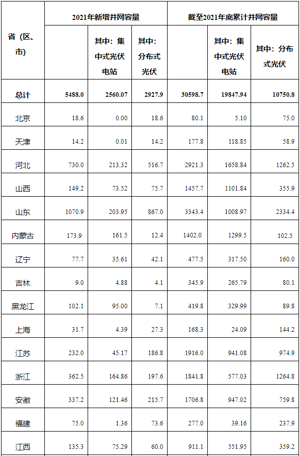 截至2021年底,累計光伏裝機容量排名前3的省份分別是山東省(33.43GW)、河北省(29.21GW)、江蘇省(19.16GW)。