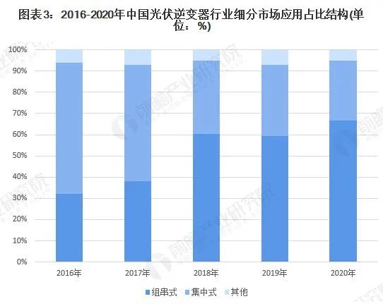 隨著分布式光伏市場的快速增長,以及集中式光伏電站中的組串式逆變器占比的提升,組串式逆變器市場整體占比增長較快,2020年超過60%。未來,隨著組串式逆變器在大型地面電站的廣泛應(yīng)用,其市場占比有望進(jìn)一步提升。