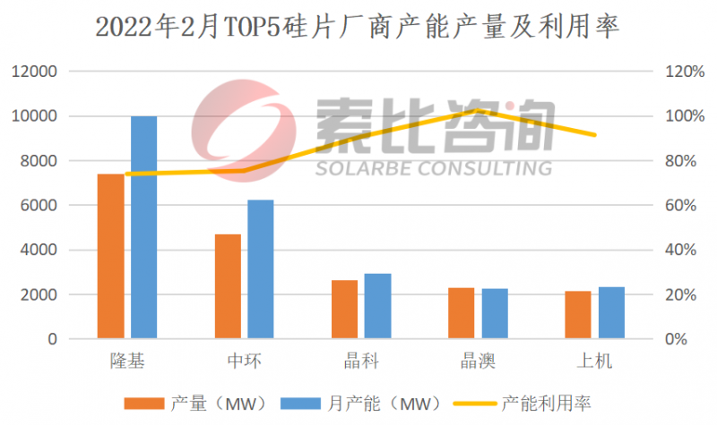 2022年2月,盡管一線企業(yè)開(kāi)工率提升超過(guò)70%,但硅片仍供不應(yīng)求。2022年2月國(guó)內(nèi)硅片產(chǎn)量24.9GW,環(huán)比增長(zhǎng)20.9%。按照產(chǎn)量排名,隆基、中環(huán)、晶科、晶澳、上機(jī)位列前五,企業(yè)總產(chǎn)量19.15GW,占比76.91%,綜合利用率86.6%。預(yù)計(jì)3月份硅片繼續(xù)維持供不應(yīng)求態(tài)勢(shì)。從供應(yīng)端來(lái)看,3月份基礎(chǔ)產(chǎn)量已達(dá)上限。從需求端來(lái)看,海外需求刺激預(yù)期將延續(xù)至3月底。