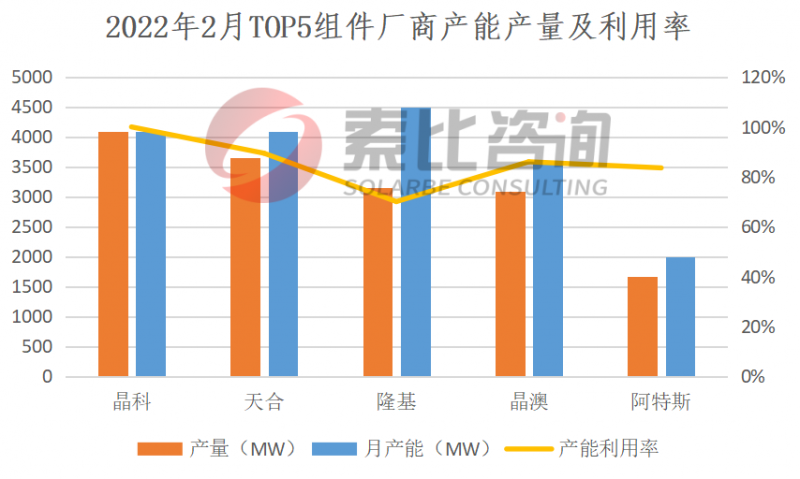 2022年2月,海內(nèi)外市場(chǎng)組件需求旺盛,國(guó)內(nèi)組件產(chǎn)量25.5GW,環(huán)比大增22.63%。一方面,國(guó)內(nèi)部分地面電站項(xiàng)目補(bǔ)裝、央國(guó)企組件開(kāi)標(biāo)規(guī)模近40GW,一方面,印度即將實(shí)施新的關(guān)稅政策引發(fā)搶裝。按照產(chǎn)量排名,晶科、天合、隆基、晶澳、阿特斯位列前五,企業(yè)總產(chǎn)量15.63GW,占比61.29%,綜合開(kāi)工率85.75%。預(yù)計(jì)2022年3月,組件需求和排產(chǎn)基本維持2月水平,國(guó)內(nèi)電站補(bǔ)裝及印度搶裝效應(yīng)逐步淡化。