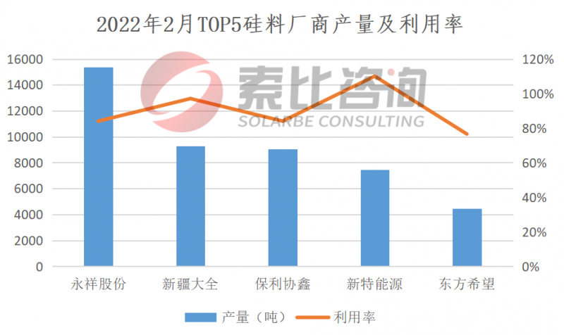2022年2月,國(guó)內(nèi)13家多晶硅企業(yè)在產(chǎn),大全、永祥、協(xié)鑫、新特?cái)U(kuò)產(chǎn)增量釋放,產(chǎn)量小幅增加。2月份國(guó)內(nèi)多晶硅產(chǎn)量為5.23萬(wàn)噸(約20.66GW),環(huán)比增長(zhǎng)0.58%。按照產(chǎn)量排名,永祥、大全、協(xié)鑫、新特、東方希望位列前五,企業(yè)總產(chǎn)量4.57萬(wàn)噸,占比87.4%,綜合利用率90.3%。索比咨詢預(yù)期3月份硅料產(chǎn)量繼續(xù)小幅上漲。從供應(yīng)端來(lái)看,國(guó)內(nèi)外終端需求上升,硅片企業(yè)開(kāi)工率持續(xù)提升,硅料擴(kuò)產(chǎn)釋放亦有增量,預(yù)計(jì)3月份協(xié)鑫、永祥、新特等企業(yè)擴(kuò)產(chǎn)產(chǎn)能仍有釋放增量。從需求端來(lái)看,供應(yīng)量增長(zhǎng),價(jià)格有望松動(dòng),進(jìn)一步刺激下游需求。