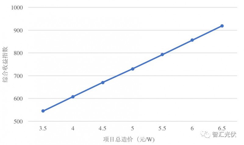 當(dāng)初始投資為6元/W時(shí),綜合收益指數(shù)(發(fā)電小時(shí)數(shù)×上網(wǎng)電價(jià))達(dá)到860時(shí),項(xiàng)目內(nèi)部收益率即可達(dá)到基準(zhǔn)收益率8%;