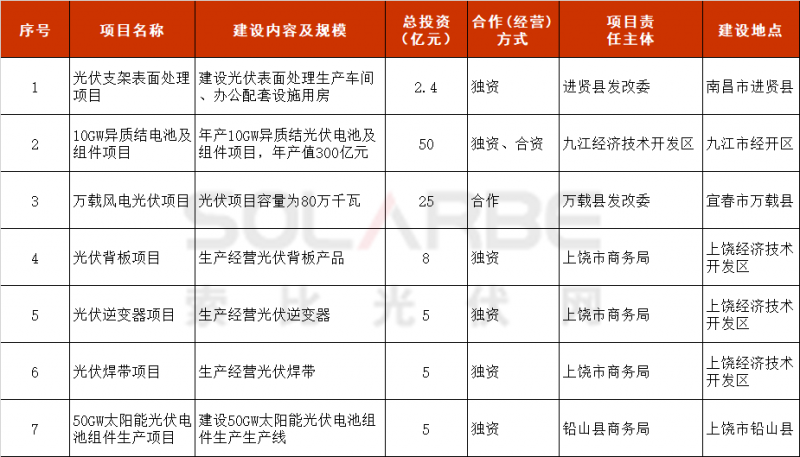 其中7個(gè)光伏項(xiàng)目入冊(cè),分別是:南昌市進(jìn)賢縣光伏支架表面處理項(xiàng)目、九江市經(jīng)開(kāi)區(qū)年產(chǎn)10GW異質(zhì)結(jié)光伏電池及組件項(xiàng)目、宜春市萬(wàn)載縣風(fēng)電光伏項(xiàng)目(光伏項(xiàng)目容量為80萬(wàn)千瓦)、上饒經(jīng)濟(jì)技術(shù)開(kāi)發(fā)區(qū)光伏背板項(xiàng)目、光伏逆變器項(xiàng)目、光伏焊帶項(xiàng)目以及上饒市鉛山縣50GW太陽(yáng)能光伏電池組件生產(chǎn)等7個(gè)項(xiàng)目。