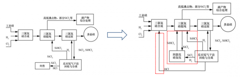 由于改良西門子法生成的副產物和尾氣較多,影響到生產成本。如何有效循環(huán)和處理產物關系到未來的降本方向。比如西門子法生產過程中會產生大量的副產物SiCl4,將SiCl4轉化成作為多晶硅生產原料的SiHCl3,從而實現(xiàn)閉環(huán)生產,以提高硅粉利用率,降低生產成本。