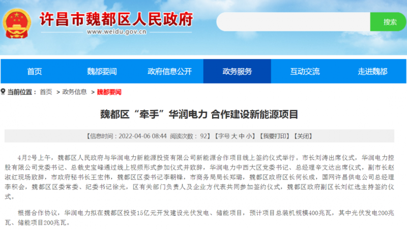 4月2號(hào),河南許昌魏都區(qū)人民政府與華潤電力新能源投資有限公司新能源合作項(xiàng)目線上簽約儀式舉行。