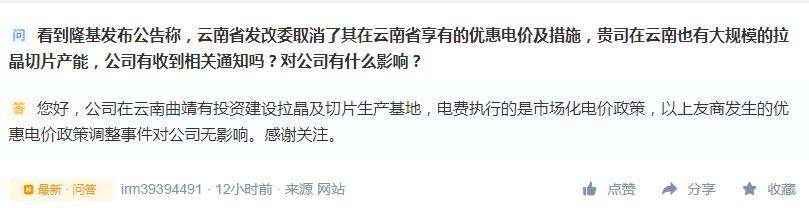 中環(huán)股份在接受媒體采訪時表示,云南取消隆基優(yōu)惠電價對公司沒有什么影響;而通威股份在接受媒體提問時則回應稱,“我們沒有收到相關(guān)的通知”。