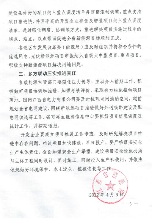 2022年4月6日,江西省能源局就加快我省新能源項目建設(shè)有關(guān)事項進(jìn)行了通知,通知包含以下內(nèi)容:1.加快推進(jìn)新能源項目建設(shè);2.建立重點項目調(diào)度機(jī)制;3.多方聯(lián)動壓實推進(jìn)責(zé)任。