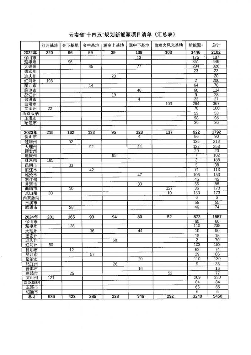 5450萬千瓦項(xiàng)目主要包括紅河基地636萬千瓦、金下基地423萬千瓦、金中基地285萬千瓦、瀾金上基地228萬千瓦、瀾中下基地346萬千瓦、曲靖火風(fēng)光基地292萬千瓦、新能源+3240萬千瓦。