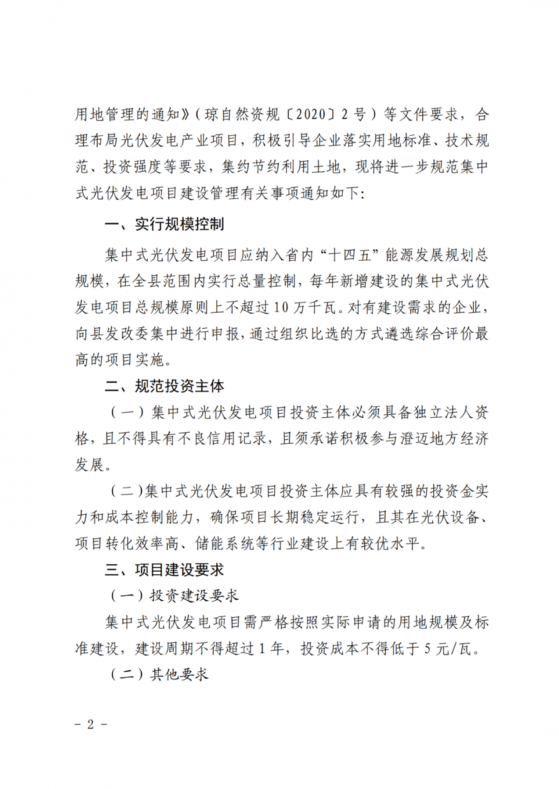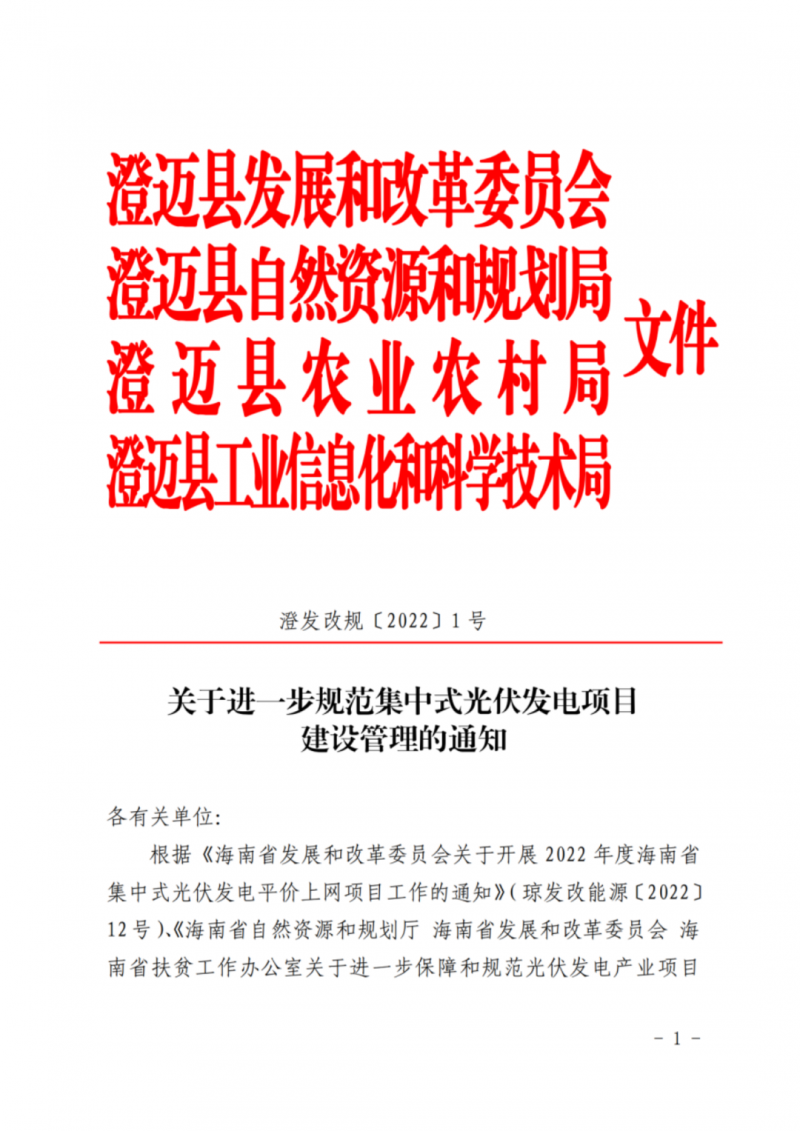 4月11日,澄邁縣發(fā)展和改革委員會(huì)、澄邁縣自然資源和規(guī)劃局、澄邁縣農(nóng)業(yè)農(nóng)村局、澄邁縣工業(yè)信息化和科學(xué)技術(shù)局聯(lián)合發(fā)布了《關(guān)于進(jìn)一步規(guī)范集中式光伏發(fā)電項(xiàng)目建設(shè)管理的通知》。本通知自2022年5月12日起施行,有效期2年。