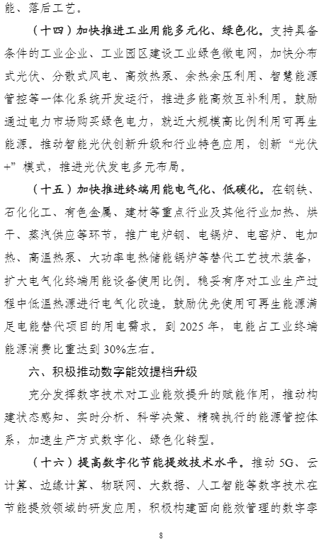 加快推進(jìn)終端用能電氣化、低碳化。在鋼鐵、石化化工、有色金屬、建材等重點(diǎn)行業(yè)及其他行業(yè)加熱、烘干、蒸汽供應(yīng)等環(huán)節(jié),推廣電爐鋼、電鍋爐、電窯爐、電加熱、高溫?zé)岜谩⒋蠊β孰姛醿?chǔ)能鍋爐等替代工藝技術(shù)裝備,擴(kuò)大電氣化終端用能設(shè)備使用比例。穩(wěn)妥有序?qū)I(yè)生產(chǎn)過程中低溫?zé)嵩催M(jìn)行電氣化改造。鼓勵(lì)優(yōu)先使用可再生能源滿足電能替代項(xiàng)目的用電需求。到2025年,電能占工業(yè)終端能源消費(fèi)比重達(dá)到30%左右。