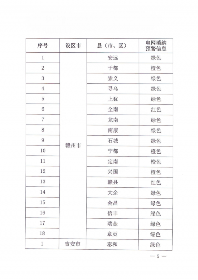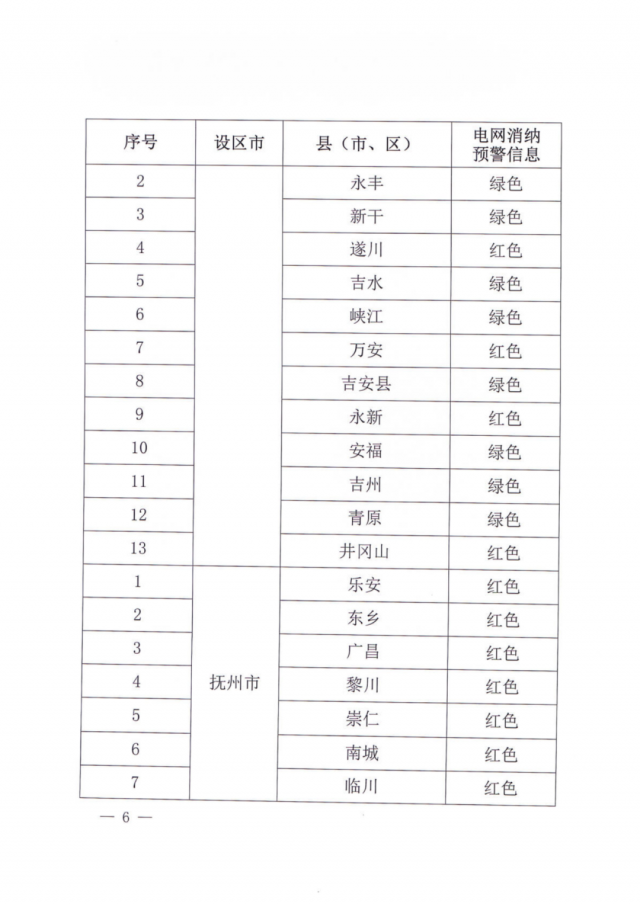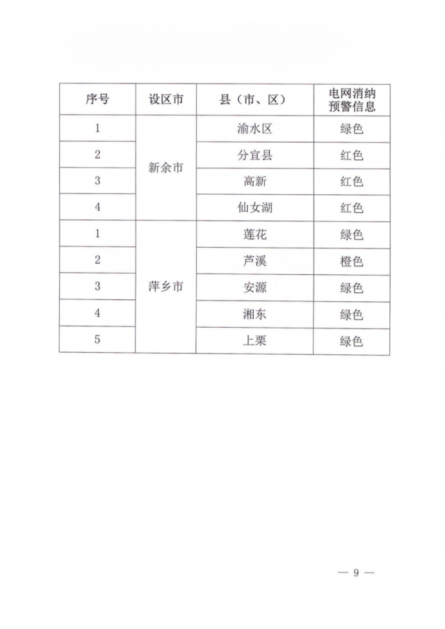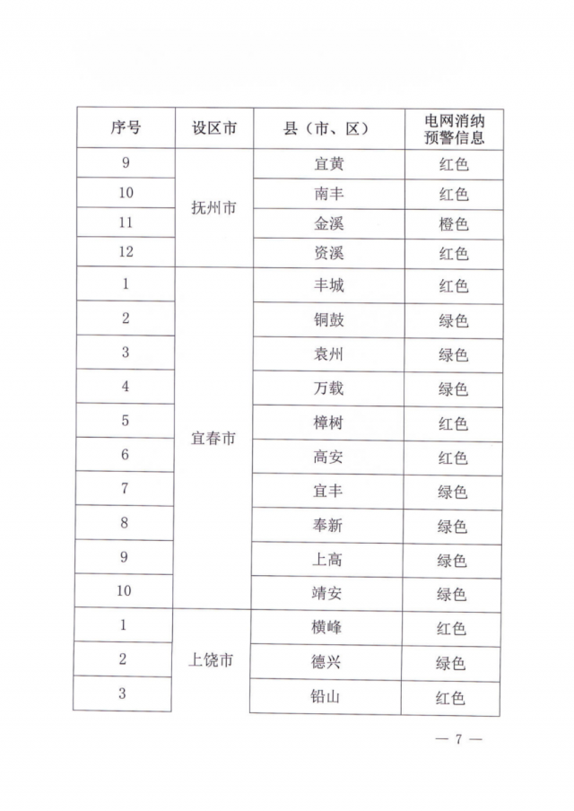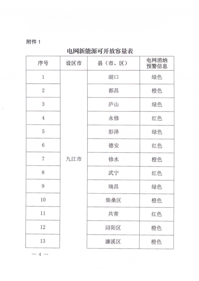 文件指出,由于新能源可開發(fā)容量呈現(xiàn)飽和狀態(tài),故給出部分市縣電網(wǎng)新能源可開放容量表。江西的94個縣市區(qū)中,已經(jīng)有27個電網(wǎng)消納預(yù)警信息為紅色,12個為橙色。