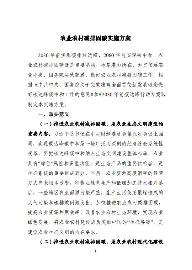 為貫徹落實碳達峰碳中和重大決策部署,推進農(nóng)業(yè)農(nóng)村綠色低碳發(fā)展,我們制定了《農(nóng)業(yè)農(nóng)村減排固碳實施方案》,現(xiàn)印發(fā)你們,請結(jié)合實際貫徹落實。