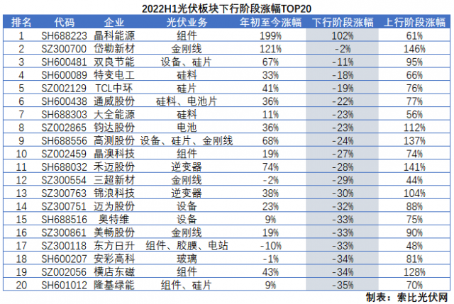 2022年上半年,光伏板塊在宏觀環(huán)境和行業(yè)基本面的共同作用下,經(jīng)歷了一輪大悲大喜的極端行情,在一度暴跌39%的情況下,4月27日A股市場(chǎng)企穩(wěn)后又暴漲60%。在這輪急漲急跌的行情中,既體現(xiàn)了光伏板塊的成長屬性,又彰顯了行業(yè)基本面的高景氣——畢竟在美聯(lián)儲(chǔ)加息周期內(nèi),成長性板塊的表現(xiàn)相對(duì)不佳,但光伏板塊在上行行情中卻有眾多個(gè)股再創(chuàng)歷史新高。