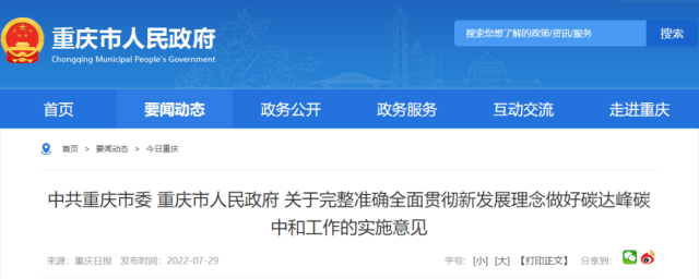 7月29日,中共重慶市委、重慶市人民政府出臺關(guān)于完整準(zhǔn)確全面貫徹新發(fā)展理念做好碳達(dá)峰碳中和工作的實(shí)施意見(以下簡稱“意見”)。