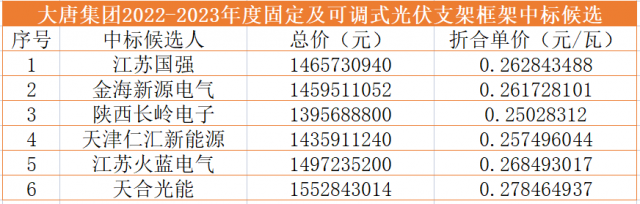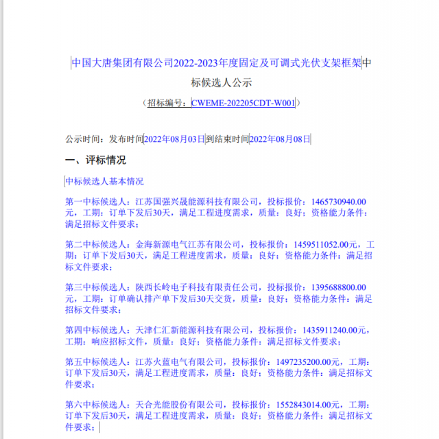 8月3日,大唐集團(tuán)公示了2022-2023年度固定及可調(diào)式光伏支架框架中標(biāo)候選人,江蘇國強(qiáng)興晟能源、金海新源電氣、陜西長嶺電子科技、天津仁匯新能源、江蘇火藍(lán)電氣、天合光能6家光伏支架供應(yīng)商入圍。