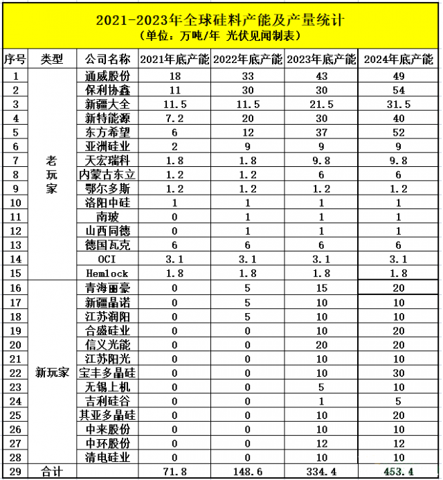 2021年以來,硅料老玩家大舉擴產(chǎn),新玩家實力雄厚如過江之鯽,這一輪硅料牛市涌現(xiàn)了將近30家硅料企業(yè)。光伏見聞根據(jù)公開消息不完全統(tǒng)計,2022年底,硅料企業(yè)新老玩家產(chǎn)能將達到148.6萬噸,2023年底,硅料企業(yè)產(chǎn)能則將達到334.4萬噸,如果產(chǎn)能完全釋放,保守估計這些硅料可生產(chǎn)的組件則分別為505GW、1136GW。
