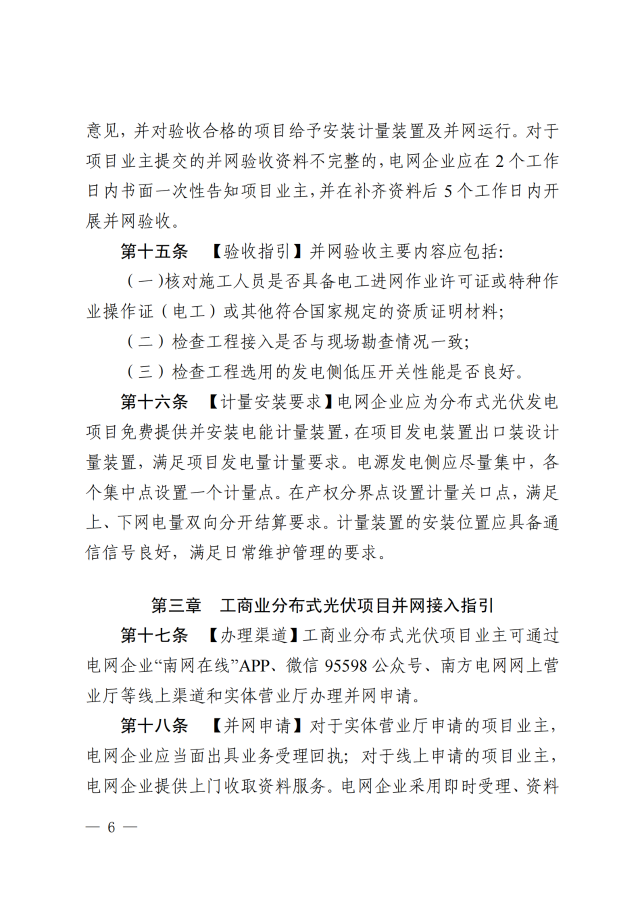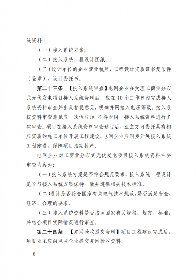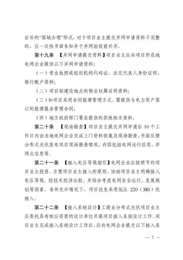 2、現(xiàn)行政策要求的其它相關(guān)資料。電網(wǎng)企業(yè)應(yīng)在5個工作日內(nèi)完成并網(wǎng)驗收并出具并網(wǎng)驗收意見,并對驗收合格的項目給予安裝計量裝臵及并網(wǎng)運行。對于項目業(yè)主提交的并網(wǎng)驗收資料不完整的,電網(wǎng)企業(yè)應(yīng)在2個工作日內(nèi)書面一次性告知項目業(yè)主,并在補齊資料后5個工作日內(nèi)開展并網(wǎng)驗收。