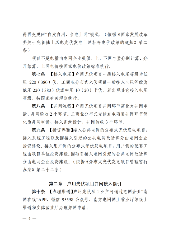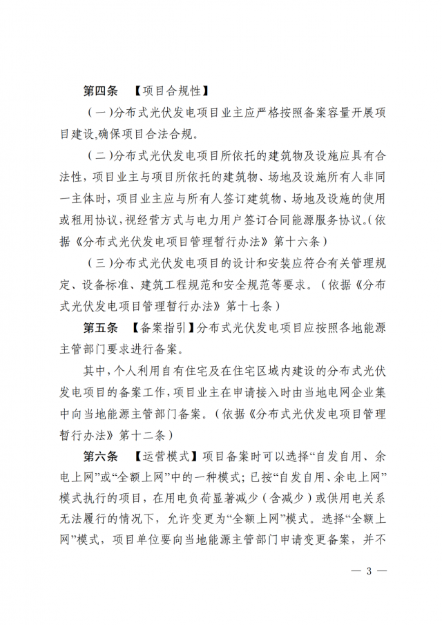 項目主要包括業(yè)主自建的戶用自然人分布式光伏項目和就地開發(fā)、就近利用且單點并網(wǎng)容量小于6兆瓦的戶用光伏以外的各類分布式光伏發(fā)電項目。文件從項目合規(guī)性、備案指引、運營模式、接入電壓、并網(wǎng)流程等方面進(jìn)行了規(guī)定。本指引自印發(fā)之日起試行,有效期2年,內(nèi)容詳細(xì),對全國其他地區(qū)具有參考意義。
