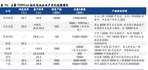 晶科能源率先扛起TOPCon規(guī)?;慨a(chǎn)大旗,天合、晶澳接踵而至;中來、一道等新興電池組件企業(yè)同樣大步邁向規(guī)模化產(chǎn)能建設(shè)。