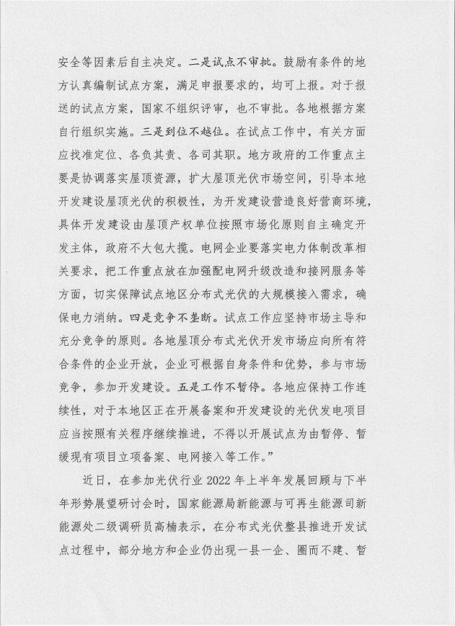 啟動(dòng)整縣(市、區(qū))推進(jìn)屋頂分布式光伏開發(fā)試點(diǎn)工作,主要目的就是充分調(diào)動(dòng)和發(fā)揮地方積極性,引導(dǎo)地方政府協(xié)調(diào)更多屋頂資源,進(jìn)一步開拓市場,擴(kuò)大屋頂分布式光伏的建設(shè)規(guī)模。去年,國家能源局提出“在開展整縣(市、區(qū))推進(jìn)屋頂分布式光伏開發(fā)試點(diǎn)工作中需要著重把握以下五個(gè)方面:一是自愿不強(qiáng)制。各地是否開展試點(diǎn)以及開展多少個(gè)試點(diǎn)由各地根據(jù)自身實(shí)際情況自己決定,不搞行政命令。建筑屋頂是否開展建設(shè),由屋頂產(chǎn)權(quán)單位綜合考慮屋頂承重、安全等因素后自主決定。二是試點(diǎn)不審批。鼓勵(lì)有條件的地方認(rèn)真編制試點(diǎn)方案,滿足申報(bào)要求的,均可上報(bào)。對于報(bào)送的試點(diǎn)方案,國家不組織評審,也不審批。各地根據(jù)方案自行組織實(shí)施。三是到位不越位。在試點(diǎn)工作中,有關(guān)方面應(yīng)找準(zhǔn)定位、各負(fù)其責(zé)、各司其職。地方政府的工作重點(diǎn)主要是協(xié)調(diào)落實(shí)屋頂資源,擴(kuò)大屋頂光伏市場空間,引導(dǎo)本地開發(fā)建設(shè)屋頂光伏的積極性,為開發(fā)建設(shè)營造良好營商環(huán)境,具體開發(fā)建設(shè)由屋頂產(chǎn)權(quán)單位按照市場化原則自主確定開發(fā)主體,政府不大包大攬。電網(wǎng)企業(yè)要落實(shí)電力體制改革相關(guān)要求,把工作重點(diǎn)放在加強(qiáng)配電網(wǎng)升級改造和接網(wǎng)服務(wù)等方面,切實(shí)保障試點(diǎn)地區(qū)分布式光伏的大規(guī)模接入需求,確保電力消納。四是競爭不壟斷。試點(diǎn)工作應(yīng)堅(jiān)持市場主導(dǎo)和充分競爭的原則。各地屋頂分布式光伏開發(fā)市場應(yīng)向所有符合條件的企業(yè)開放,企業(yè)可根據(jù)自身?xiàng)l件和優(yōu)勢,參與市場競爭,參加開發(fā)建設(shè)。五是工作不暫停。各地應(yīng)保持工作連續(xù)性,對于本地區(qū)正在開展備案和開發(fā)建設(shè)的光伏發(fā)電項(xiàng)目應(yīng)當(dāng)按照有關(guān)程序繼續(xù)推進(jìn),不得以開展試點(diǎn)為由暫停、暫緩現(xiàn)有項(xiàng)目立項(xiàng)備案、電網(wǎng)接入等工作?!?/p>