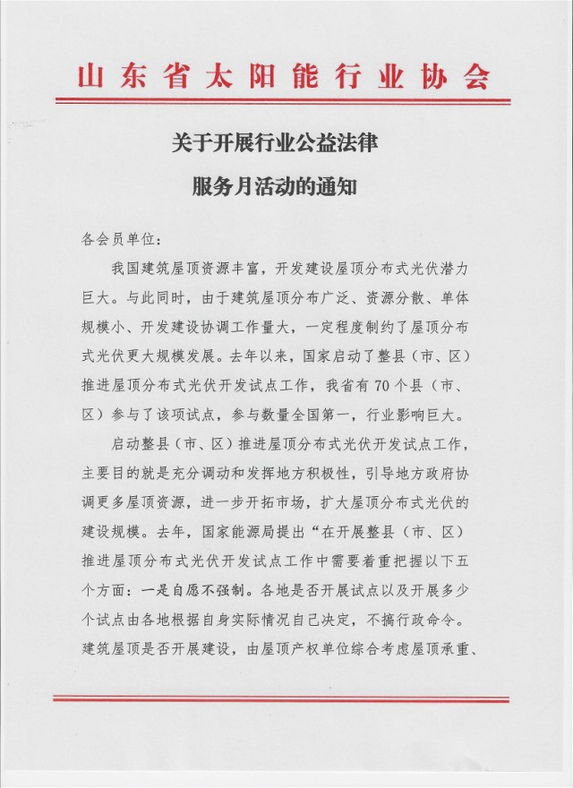 上述“一縣一企、圈而不建、暫停備案”等問題的存在,也嚴(yán)重影響了我省太陽能光伏行業(yè)企業(yè)、尤其是分布式光伏開發(fā)企業(yè)的健康穩(wěn)定發(fā)展。為進(jìn)一步維護(hù)行業(yè)企業(yè)權(quán)益、提高行業(yè)企業(yè)法律意識(shí)、推動(dòng)行業(yè)健康穩(wěn)定可持續(xù)發(fā)展,山東省太陽能行業(yè)協(xié)會(huì)擬于近期開展會(huì)員法律服務(wù)月活動(dòng),聘請國家級權(quán)威法律服務(wù)機(jī)構(gòu)為行業(yè)企業(yè)答疑解惑,并集中開展行業(yè)公益法律服務(wù)進(jìn)企業(yè)活動(dòng),合法維護(hù)會(huì)員權(quán)利。
