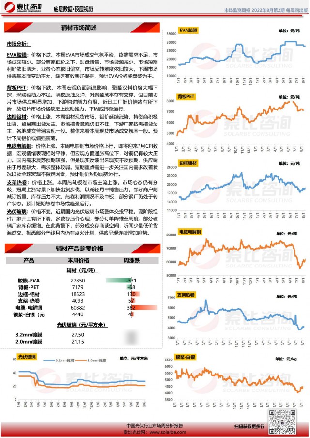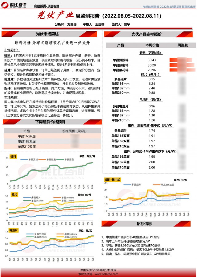 光伏產(chǎn)業(yè)周監(jiān)測(cè)報(bào)告系索比咨詢對(duì)于光伏產(chǎn)業(yè)鏈上下游價(jià)格的監(jiān)測(cè)與預(yù)報(bào),幫助企業(yè)獲得最實(shí)時(shí)的參考價(jià)格。每周除了對(duì)硅料、硅片、電池片、組件、輔材等價(jià)格進(jìn)行追蹤和分析外,亦關(guān)注下游招標(biāo)動(dòng)態(tài),并對(duì)后續(xù)市場(chǎng)趨勢(shì)做出研判。