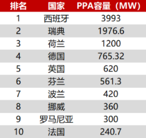 表:2021年歐洲PPA簽約量前十的國家