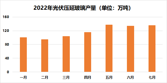 2022年1-7月,全國光伏壓延玻璃新增在產產能同比增長63.6%,截至7月底,全國光伏壓延玻璃在產企業(yè)共計38家,投產110窯352條生產線,產能6.5萬噸/日,其中在產93窯315條生產線,產能6.0萬噸/日。光伏壓延玻璃累計產量821.2萬噸,同比增加50.8%。其中,7月份光伏壓延玻璃產量135.6萬噸,同比增加62.8%。7月底庫存約21天,比6月底庫存增加3天。