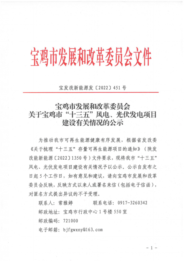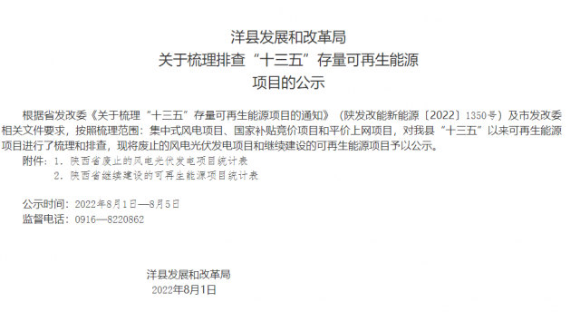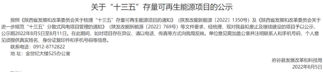 根據(jù)省發(fā)展改革委《關(guān)于梳理“十三五”存量可再生能源項(xiàng)目的通知》(陜發(fā)改能新能源〔2022〕1350號(hào))文件要求,現(xiàn)將我市擬上報(bào)省發(fā)改委“十三五”風(fēng)電、光伏發(fā)電項(xiàng)目建設(shè)有關(guān)情況予以公示。公示自發(fā)布之日起5個(gè)工作日,如有意見和建議,請向渭南市發(fā)展和改革委員會(huì)反映,反映方式以來人或署名來信(包括電子信函),對(duì)匿名方式提出異議的不予受理。