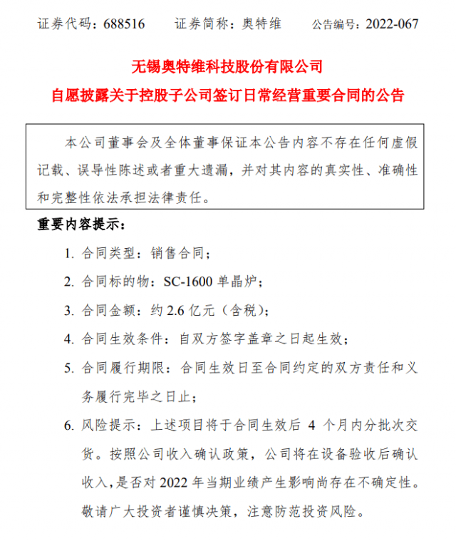 近日,奧特維發(fā)布公告稱,公司控股子公司無錫松瓷機(jī)電有限公司(以下簡稱“松瓷機(jī)電”)近日與天合光能(青海)晶硅有限公司簽訂《采購合同》,松瓷機(jī)電向天合光能(青海)晶硅有限公司銷售SC-1600單晶爐,合同金額約2.6億元(含稅)。