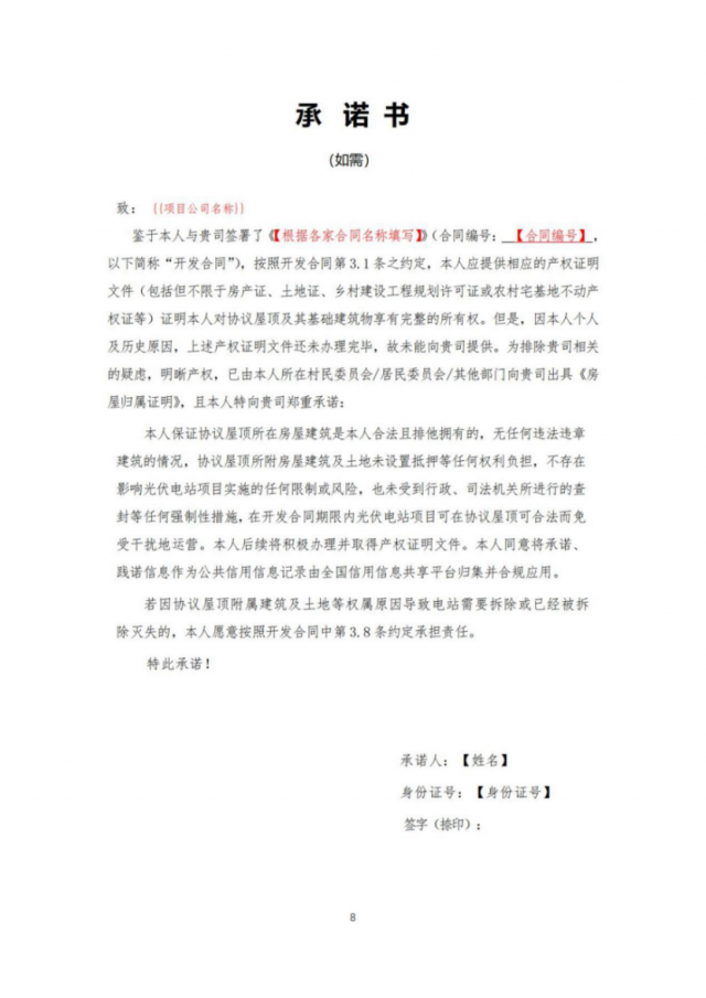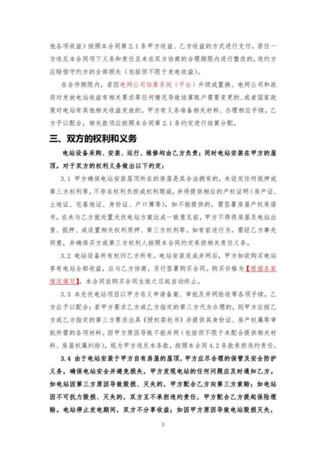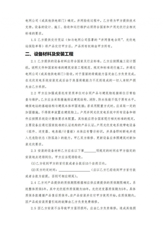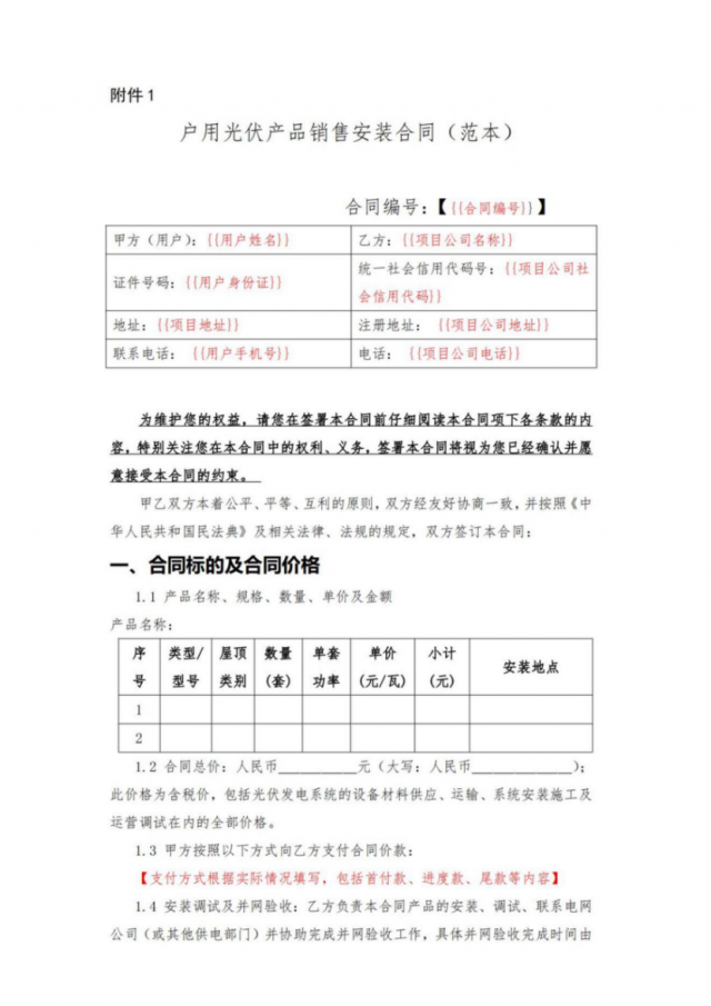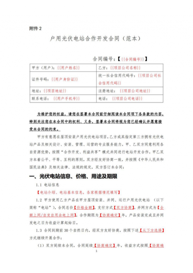8月30日, 國家能源局轉(zhuǎn)發(fā)了此前中國光伏行業(yè)協(xié)會在充分征求各方面意見基礎(chǔ)上,編制發(fā)布的《戶用光伏產(chǎn)品銷售安裝合同(范本)》和《戶用光伏電站合作開發(fā)合同(范本)》,供居民用戶和光伏開發(fā)企業(yè)、戶用光伏經(jīng)銷商等各方參考。