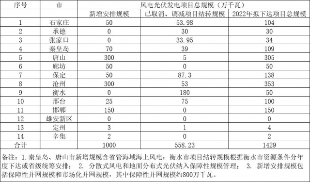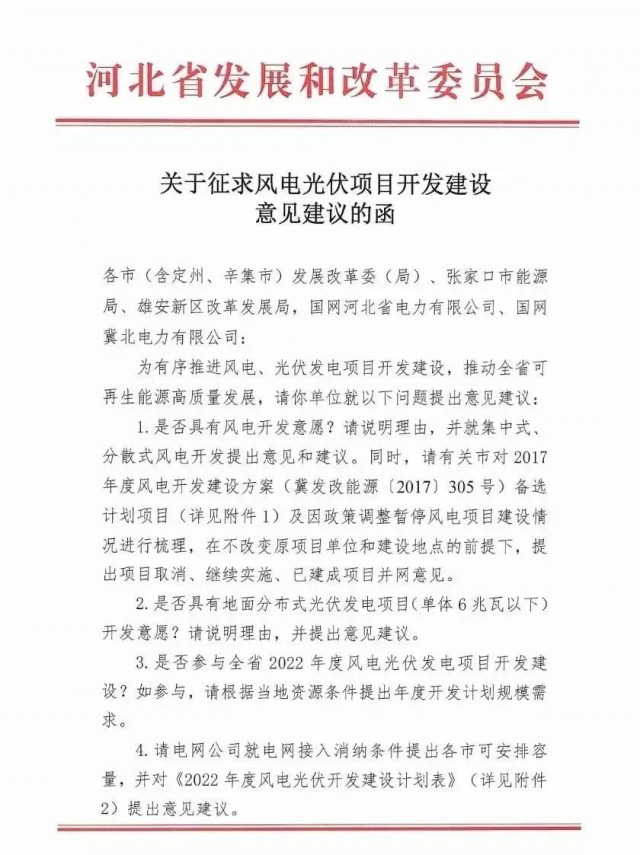 在征求意見(jiàn)函中,河北省發(fā)改委要求各地主管部門就風(fēng)電、地面分布式光伏開(kāi)發(fā)意愿進(jìn)行說(shuō)明,并請(qǐng)電網(wǎng)公司就電網(wǎng)接入消納條件提出各市可安排容量,并對(duì)《2022年度風(fēng)電光伏開(kāi)發(fā)建設(shè)計(jì)劃表》提出意見(jiàn)建議。