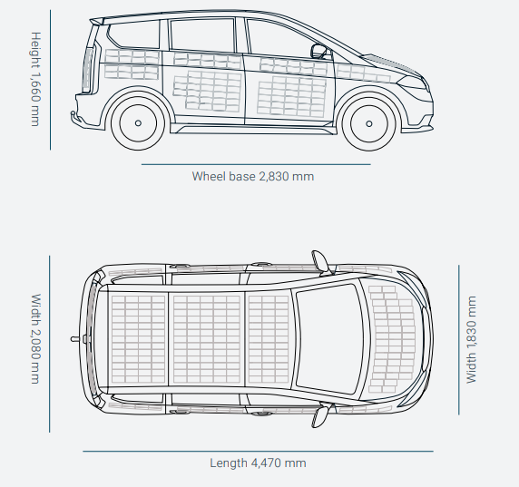 Sion配置了一個(gè)54 kWh的LFP電池組。電池并不大。但是這款車(chē)還有后招來(lái)確保續(xù)航里程。Sion的發(fā)動(dòng)機(jī)罩,擋泥板,側(cè)面,車(chē)頂和車(chē)輛后部裝有太陽(yáng)能電池。456個(gè)太陽(yáng)能半電池和整個(gè)車(chē)身融合。這就是這款車(chē)的特別之處。Sono Motors表示這些半電池每周可增加112-245公里的續(xù)航里程。平均每天可以增加16-35公里。Sono Motors表示,如果這款車(chē)在德國(guó)市區(qū)使用,充電量是同一細(xì)分市場(chǎng)的傳統(tǒng)電動(dòng)汽車(chē)的四分之一。