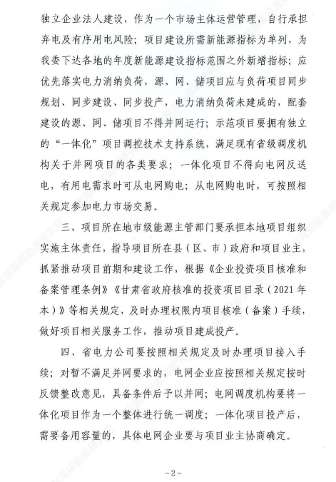 一體化項目包含的電源、電網(wǎng)、負荷、儲能由一個獨立企業(yè)法人建設(shè),作為一個市場主體運營管理,自行承擔棄電及有序用電風險;項目建設(shè)所需新能源指標為單列,為甘肅省發(fā)改委下達各地的年度新能源建設(shè)指標范圍之外新增指標;應(yīng)優(yōu)先落實電力消納負荷,源、網(wǎng)、儲項目應(yīng)與負荷項目同步規(guī)劃、同步建設(shè)、同步投產(chǎn),電力消納負荷未建成的,配套建設(shè)的源、網(wǎng)、儲項目不得并網(wǎng)運行;示范項目要擁有獨立 的“一體化”項目調(diào)控技術(shù)支持系統(tǒng),滿足現(xiàn)有省級調(diào)度機構(gòu)關(guān)于并網(wǎng)項目的各類要求;一體化項目不得向電網(wǎng)反送電,有用電需求時可從電網(wǎng)購電;從電網(wǎng)購電時,可按照相關(guān)規(guī)定參加電力市場交易。