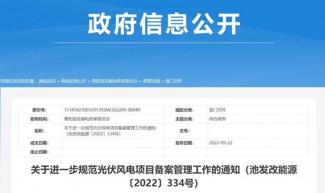 9月22日,安徽青陽縣發(fā)改委官網(wǎng)公布《關(guān)于進(jìn)一步規(guī)范光伏風(fēng)電項目備案管理工作的通知》。