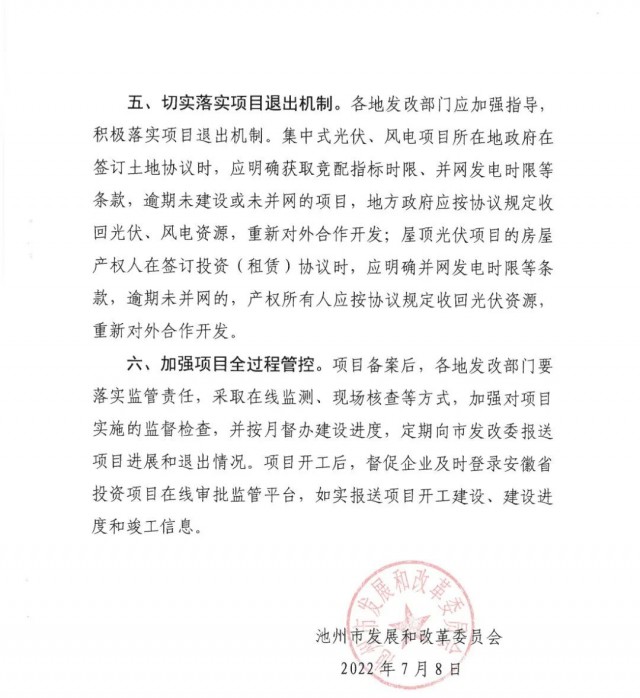 通知強(qiáng)調(diào):各地要嚴(yán)格按照《中共池州市委池州市人民政府關(guān)于深入學(xué)習(xí)貫徹省第十一次黨代會精神忠誠盡職奮勇爭先加快建設(shè)現(xiàn)代化“三優(yōu)池州”的實施意見》(池發(fā)(2021] 16號)和市政府關(guān)于光伏招商項目市級預(yù)審規(guī)定,未經(jīng)市級預(yù)審的地面(水面)光伏、風(fēng)電項目,各縣區(qū)、園區(qū)不得簽訂投資協(xié)議。