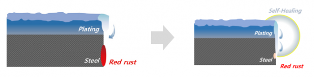 革新后的鍍鎂鋁鋅板在截面產(chǎn)生時,材料上部的鍍鋅層溶解并使截面被覆蓋,促進穩(wěn)定的腐蝕生成物的生長。通過增加鍍層內(nèi)的Mg含量(%)及確保與Al含量(%)的最佳平衡,在促成切面部位優(yōu)越的的MgZn2腐蝕生成物增大的同時,也使其更加致密、堅固,進而加快耐腐蝕屏障(Self-Healing Zone)生成的速度,因此在自愈效果上與常用的高耐腐蝕鍍鋅鋼板相比,產(chǎn)生了明顯的差異。