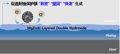 市面上普遍使用的鍍鋅材料,其耐蝕原理是在氧化過程中生成包含多個氣孔的飽和氧化皮膜層,隨著腐蝕因子(氧、水分、鹽分等)對氧化皮膜層的不斷侵蝕,表面鋅層厚度也不斷損耗,因此產(chǎn)品壽命受到極大影響。而這種革新性材料,其鍍層中的鎂(Mg)會促進非常穩(wěn)定狀態(tài)的致密腐蝕生成物L(fēng)DH(Layered Double Hydroxide,層狀雙氫氧化物),再基于LDH形成全面的屏障并推遲腐蝕的發(fā)生,幾乎不發(fā)生損耗。