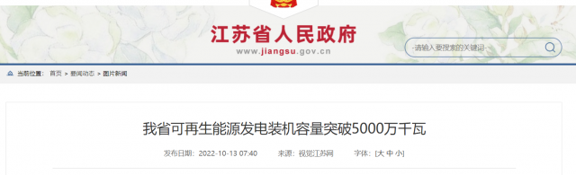 截至2022年10月11日,江蘇省可再生能源發(fā)電總裝機(jī)突破5000萬(wàn)千瓦,達(dá)到5109萬(wàn)千瓦,其中風(fēng)電2247萬(wàn)千瓦,光伏2277萬(wàn)千瓦,生物質(zhì)295萬(wàn)千瓦,抽水蓄能260萬(wàn)千瓦,儲(chǔ)能30萬(wàn)千瓦。
