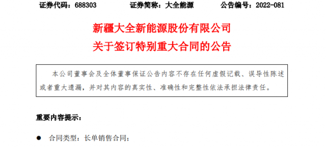 大全能源(688303)公告稱,公司及全資子公司內(nèi)蒙古大全近日與某客戶簽訂合同,2023年至2027年某客戶預(yù)計(jì)共采購4.62萬噸太陽能級(jí)原生多晶硅。按照PV Infolink最新公布的多晶硅致密料均價(jià)30.30萬元/噸測(cè)算,預(yù)計(jì)采購金額約為139.99億元。實(shí)際采購價(jià)格采取按周議價(jià)方式,金額以當(dāng)周采購訂單為準(zhǔn)。