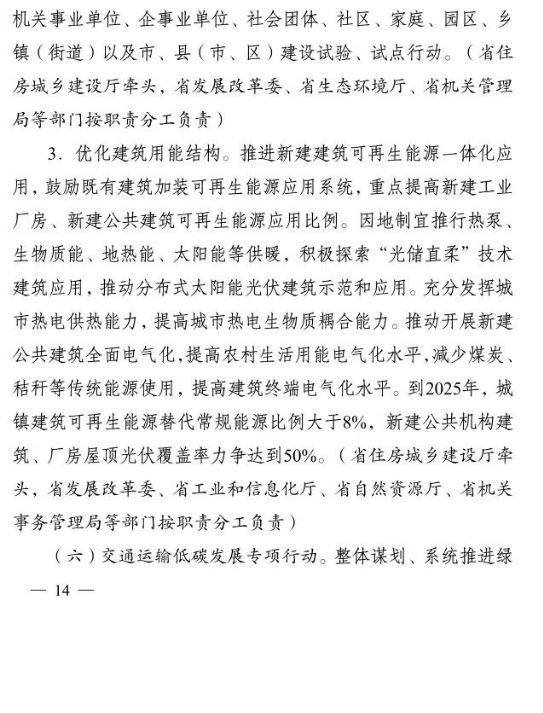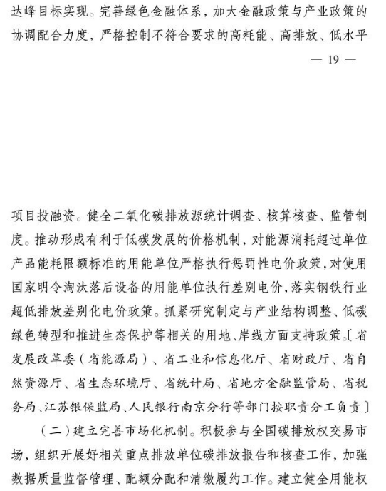 10月2日,江蘇省人民政府印發(fā)《江蘇省碳達峰實施方案》。文件提出,大力發(fā)展非化石能源。積極增加可再生能源消費,落實國家下達的可再生能源電力消納責任權重,新增跨省跨區(qū)通道可再生能源電量比例不低于50%.光伏方面,堅持集中式和分布式并重,穩(wěn)步有序開展海上光伏建設,加快推進光伏復合利用,全力發(fā)展分布式光伏系統(tǒng),開展整縣(市、區(qū))屋頂分布式光伏開發(fā)試點。到2025年,全省光伏發(fā)電裝機達到3500萬千瓦以上。風電方面,優(yōu)化風電發(fā)展結構,全力推進近海海上風電規(guī)?;l(fā)展,穩(wěn)妥開展深遠海風電示范建設。推動風電裝備制造業(yè)規(guī)模化、集聚化、高端化發(fā)展,加強關鍵核心部件研發(fā)。到2025年,全省風電裝機達到2800萬千瓦以上。核電方面,在確保絕對安全的前提下安全有序發(fā)展核電,加快規(guī)劃建設連云港千萬千瓦級核電基地,加強核電關鍵技術、核電裝備研發(fā)和核能多元化綜合利用,積極穩(wěn)妥推進綠色核能供熱示范項目,研究制訂核能利用支持政策。其他方面,因地制宜規(guī)劃發(fā)展生物質能,積極推進沼氣發(fā)電項目建設,統(tǒng)籌布局垃圾焚燒電站項目。因地制宜加強水能利用,科學推進抽水蓄能開發(fā)。大力推進光熱能、地熱能、空氣熱能等可再生能源的非電化利用,加快推動氫能研究與推廣應用。力爭到2025年底全省生物質發(fā)電裝機規(guī)模達到300萬千瓦。