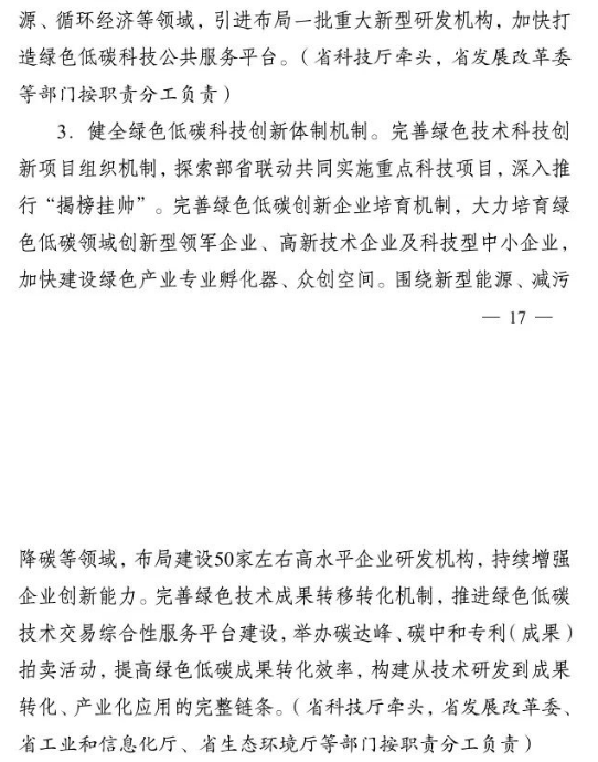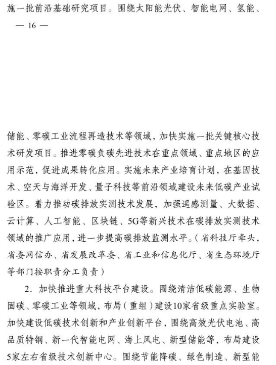 加快推進重大科技平臺建設。圍繞清潔低碳能源、生物固碳、零碳工業(yè)等領域,布局(重組)建設10家省級重點實驗室。加快建設低碳技術創(chuàng)新和產業(yè)創(chuàng)新平臺,圍繞高效光伏電池、高品質特鋼、新一代智能電網(wǎng)、海上風電、新型儲能等,布局建設5家左右省級技術創(chuàng)新中心。圍繞節(jié)能降碳、綠色制造、新型能源、循環(huán)經(jīng)濟等領域,引進布局一批重大新型研發(fā)機構,加快打造綠色低碳科技公共服務平臺。