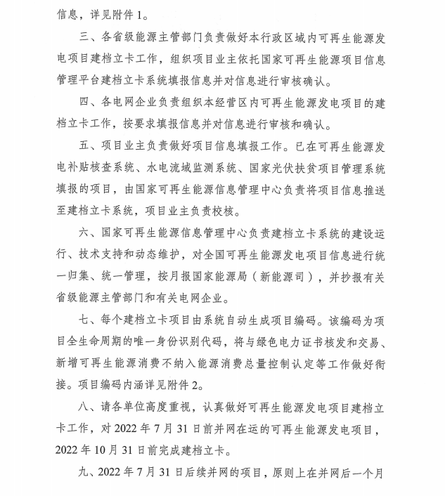對(duì)2022年7月31 日前并網(wǎng)在運(yùn)的可再生能源發(fā)電項(xiàng)目,2022 年10月31日前完成建檔立卡。
