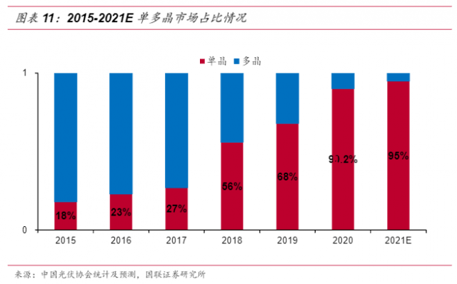 國(guó)聯(lián)證券研究所的數(shù)據(jù)顯示:2018年,單晶的市場(chǎng)份額占比達(dá)到了56%,到2021年則高達(dá)95%。五年間,單晶硅市場(chǎng)占比翻了5倍。
