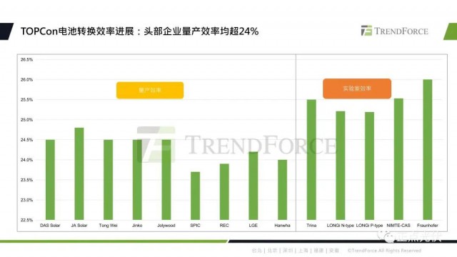 當(dāng)前,TOPCon頭部企業(yè)的量產(chǎn)效率都突破了24%,比PERC平均要高0.5%-0.8%,2023年的量產(chǎn)效率也有望朝著24.5%-25%邁進(jìn)。TOPCon的實驗室轉(zhuǎn)換效率目前都超過了25%,今年的四月份晶科公布了182版型的n型TOPCon電池片的轉(zhuǎn)換效率,已經(jīng)達(dá)到了25.7%,打破新的記錄。