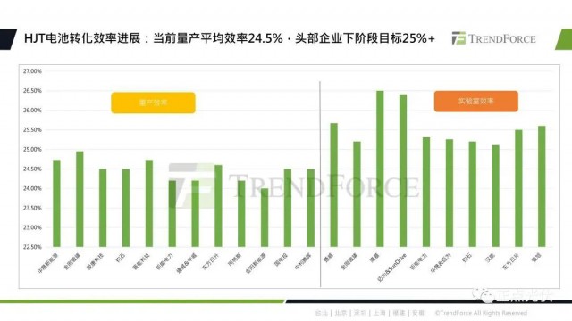 再來具體看一下HJT技術(shù)產(chǎn)能進(jìn)展及效率方面。目前HJT技術(shù)發(fā)展進(jìn)入瓶頸期,全球企業(yè)宣告的已建成產(chǎn)能為11.6GW。雖然規(guī)劃的產(chǎn)能比較多,但是待建的產(chǎn)能還是比較少的。核心原因還是因為當(dāng)前HJT的生產(chǎn)成本相對較高,與PERC量產(chǎn)效率并未顯出更高水平,產(chǎn)品溢價有限。